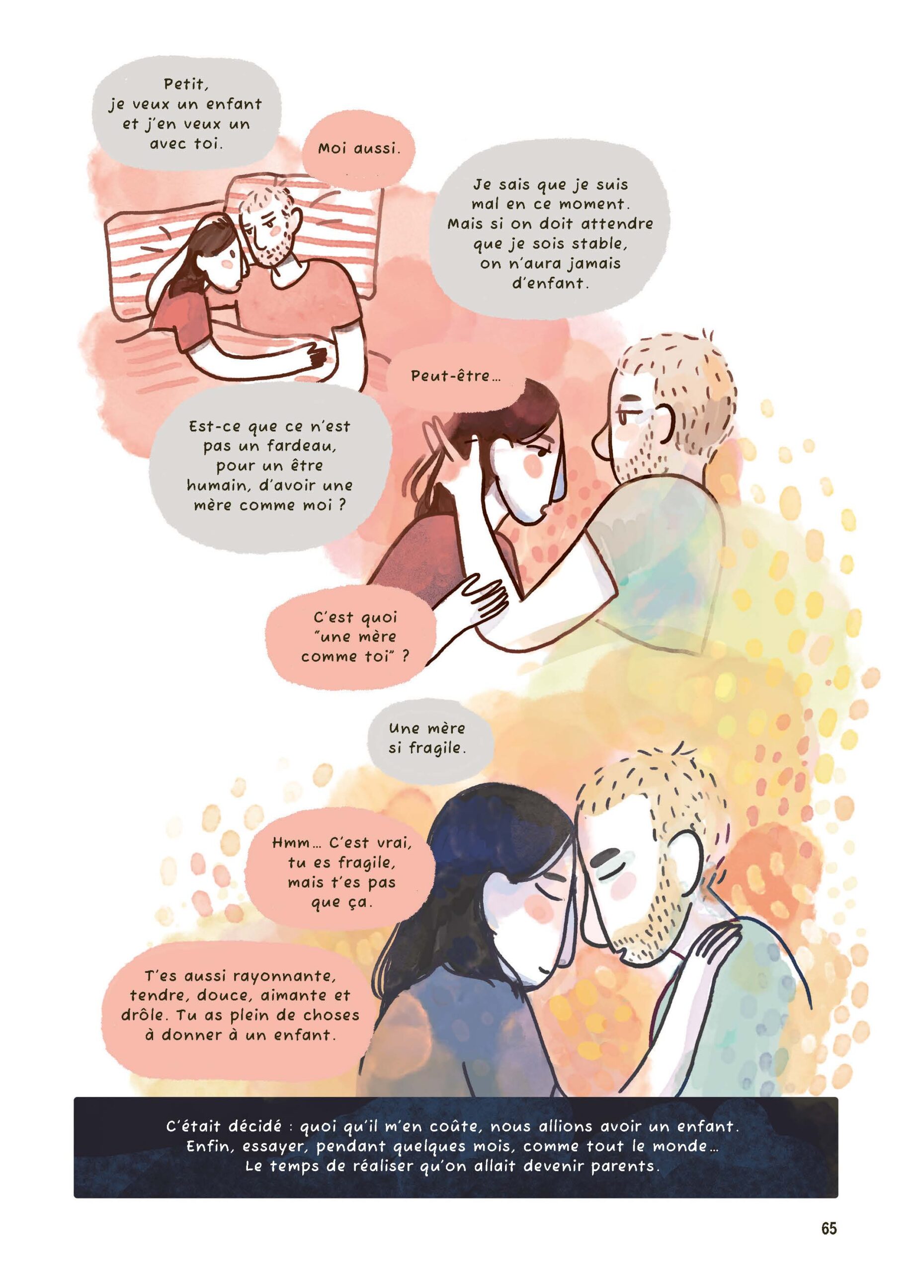 Le psychiatre qui la suit lui apprend qu’elle fait une « dépression prénatale » et que cela touche plus de 10 % des femmes enceintes. Et puis il lui annonce qu’elle est bipolaire, lui propose un traitement. Après dix années d’une épuisante errance thérapeutique, un timide espoir perce l’obscurité.