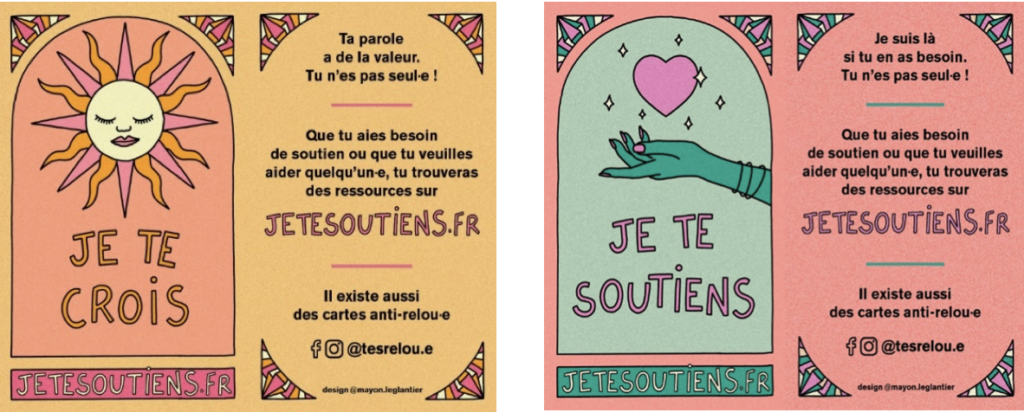 Le programme psychoéducatif Sexotopie est conçu pour améliorer la qualité de vie des patients suivis en psychiatrie en favorisant une meilleure compréhension de leur vie affective, intime et sexuelle. Les soignants à l’origine de ce programme ont récemment découvert un outil de lutte contre les Violences sexistes et sexuelles (VSS) utilisé lors de festivals : T’esrelou.e. Concrètement, il s’agit de 7 cartes illustrant un comportement inapproprié dans le cadre de la Vie intime affective et sexuelle (VIAS) : 5 cartes “Anti relou.e” et 2 cartes “Love” (voir ci-dessous). Des questions émergent alors : ce support pourrait-il faciliter le dialogue dans les unités de soins et ainsi constituer un levier pour la prévention et l’éducation à la VIAS ? Nous décidons de tester T’esrelou.e pour les usagers et les cartes sont alors mises à leur disposition dans les unités. Des personnes s’en emparent comme par exemple :
